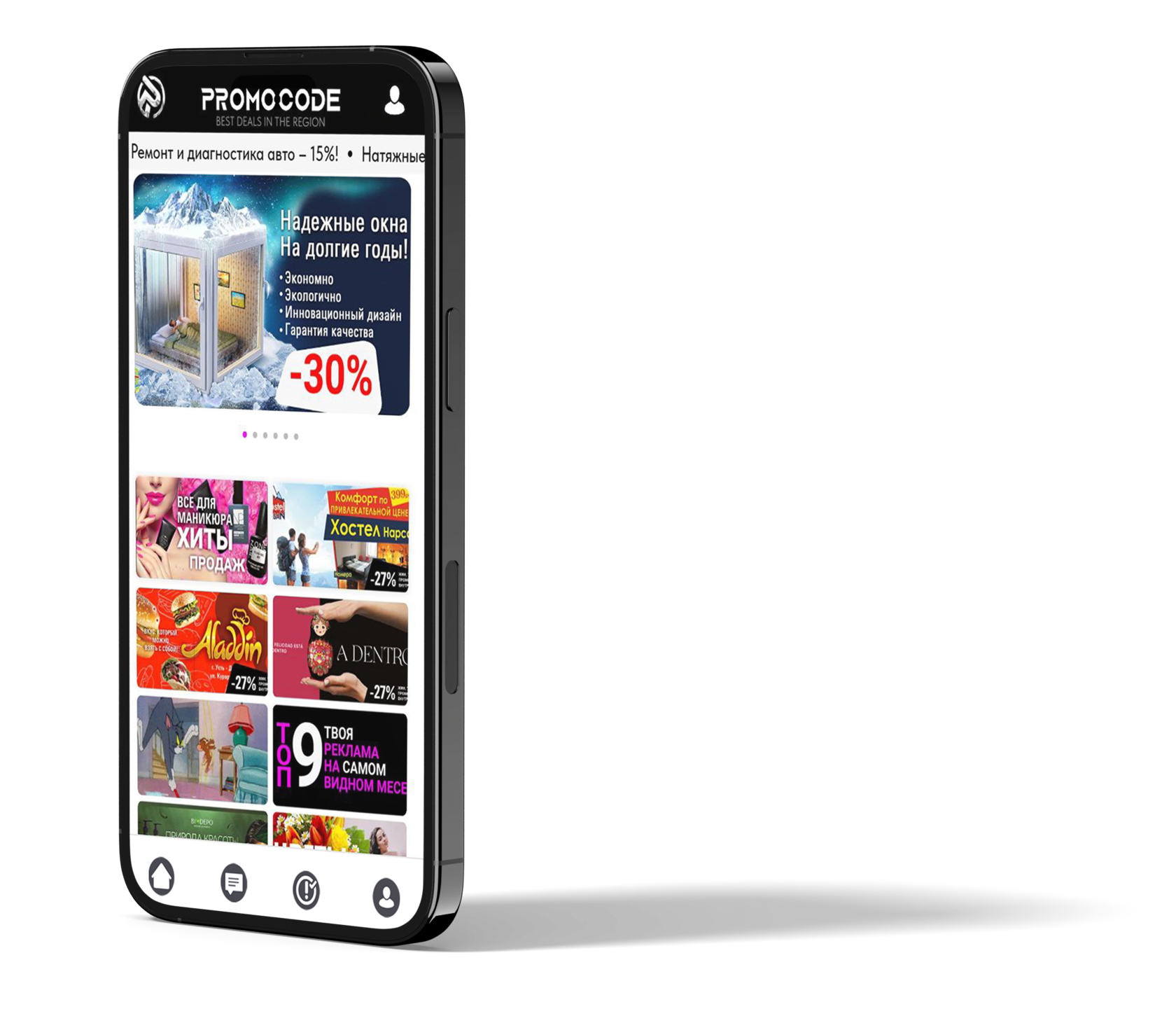 Для участника «Promocode» разрабатывается персональная карточка(креатив) партнёра. С уникальным дизайном, где будет указано спец предложение от партнёра. Карточка размещается на главной странице сайта.